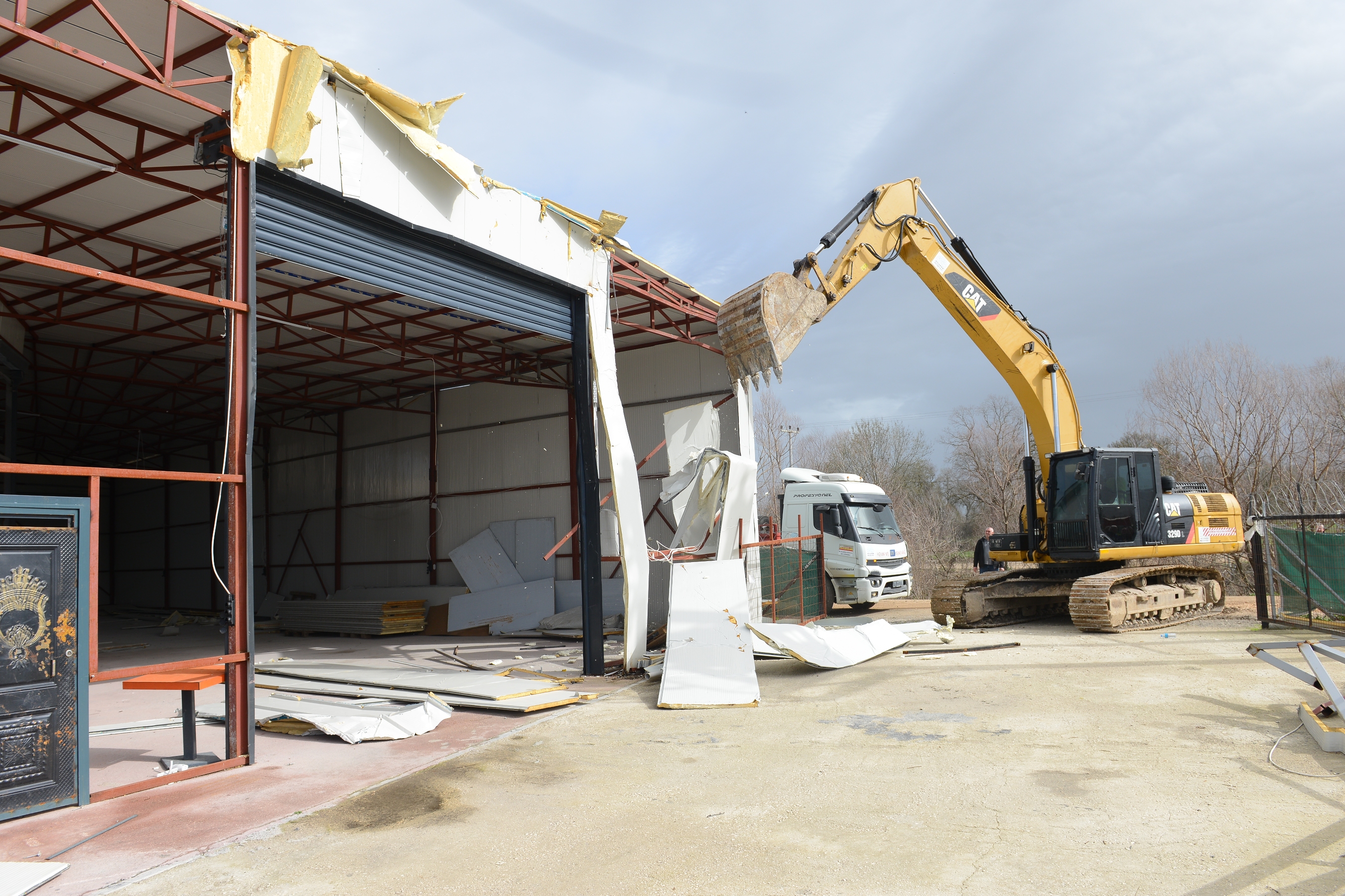 Günün ilk müdahalesi, fabrika olarak kullanılan 600 metrekarelik kaçak yapıya yapıldı. Yıkım öncesinde işletme sahibinin mağduriyet yaşamaması için içerideki makine ve üretim ekipmanları titizlikle tahliye edildi. Malzemelerin zarar görmemesi sağlandıktan sonra iş makineleri devreye girdi ve yapı tamamen yıkıldı.
