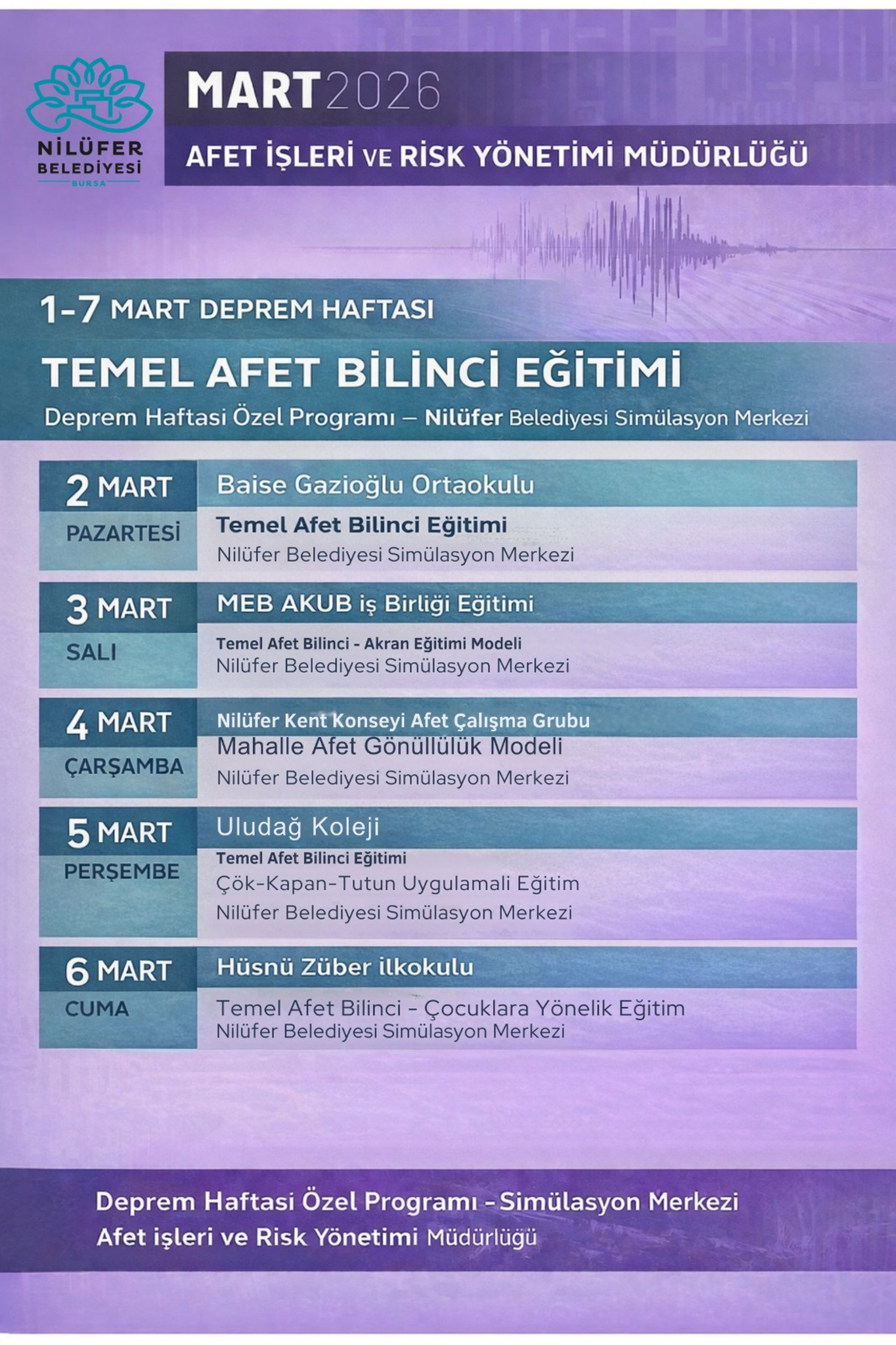 Eğitimler, 2 Mart Pazartesi günü Baise Gazioğlu Bosut Ortaokulu öğrencilerine verilen Temel Afet Bilinci Eğitimi ile başladı. 3 Mart Salı günü, MEB AKUB iş birliğiyle yürütülen Akran Eğitimi Modeli ile program devam edecek.Mahalle Afet Gönüllülük Modeli Masaya Yatırılacak