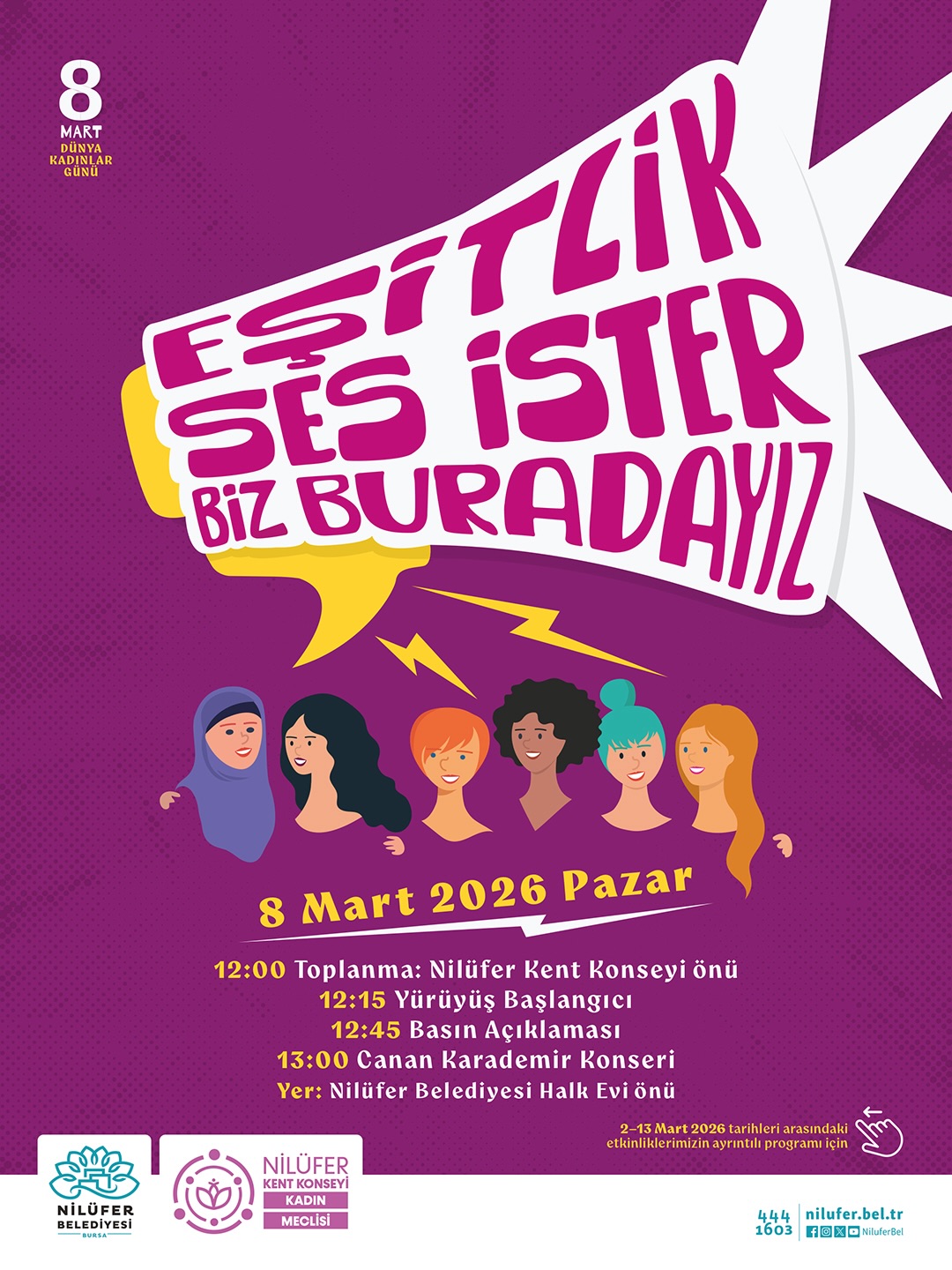 Nilüfer Belediyesi ve Nilüfer Kent Konseyi iş birliğiyle hazırlanan 8 Mart Dünya Kadınlar Günü programı, 2 Mart Pazartesi günü başlıyor. Bir hafta boyunca sürecek etkinlikler kapsamında söyleşiler, paneller, atölyeler ve film gösterimleri düzenlenecek, program ise 8 Mart’ta yapılacak yürüyüşle sona erecek.