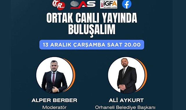 Bursa Orhaneli Belediye Başkanı Ali Aykurt, Alper Berber'in moderatörlüğünde gerçekleşecek ortak canlı yayına konuk oluyor.BURSA (İGFA) - İGF Haber Ajansı bünyesindeki İGFA ve İGF TV'den de yayınlanacak ortak canlı yayın 13 Aralık Çarşamba (bu akşam) saat 20.00'de başlayacak.Orhaneli Belediye Başkanı Ali Aykurt, 5 yılda Orhaneli'de yapılmış hizmetleri ve hedefleri ve ilçe ile ilgili önemli konuları bu programda masaya yatıracak.