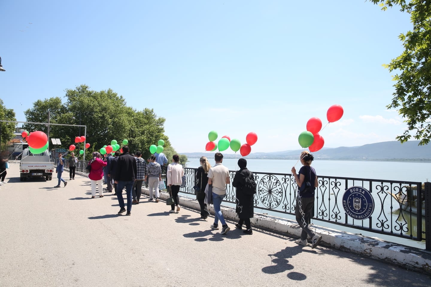 hediye etti. Konuklar da çocuklara Nilüfer Belediyesi’nin hediyelerini verdi. Kahvaltı sonrası balonlar eşliğinde kortej yapan katılımcılar, Gölyazı Köprüsü’ne yürüdü. Çocuklar, köprü üzerine geldiklerinde de bağımlılıktan kurtulmanın ve özgürlüğün temsili olarak balonları gökyüzüne uçurdu.