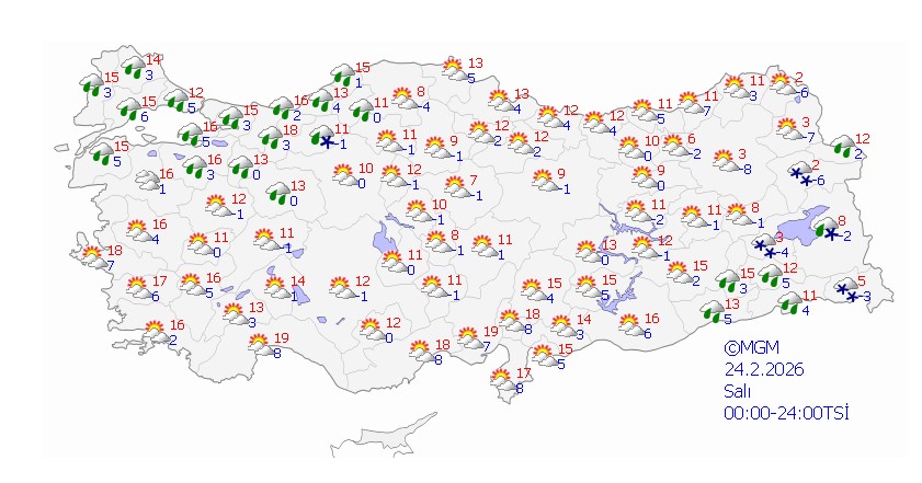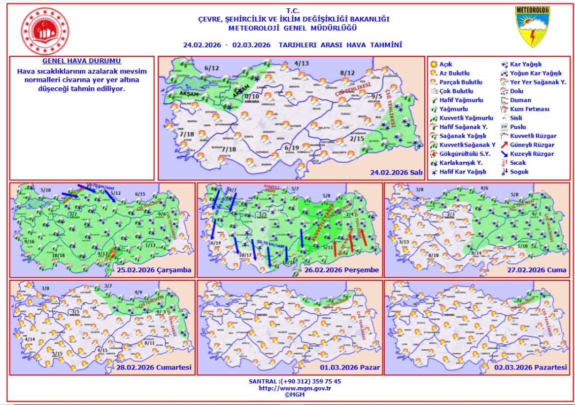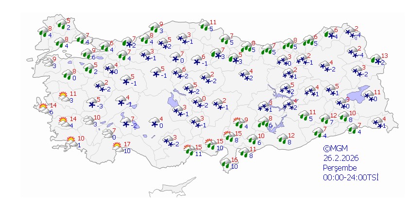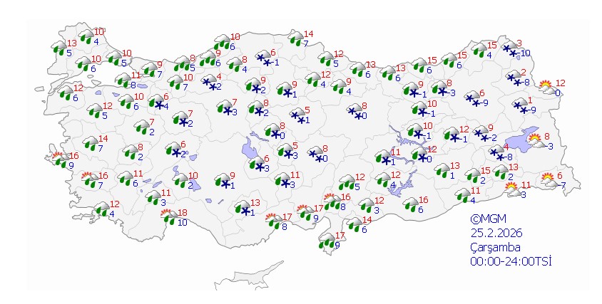 Yağışlar, genellikle yağmur ve sağanak şeklinde olacak, iç ve yüksek kesimlerde ise karla karışık yağmur ve kar görülecek. Doğu Karadeniz’in yüksek kesimleri ile Doğu Anadolu’nun doğusunda çığ ve kar erimesi tehlikesine karşı uyarılar yapıldı.