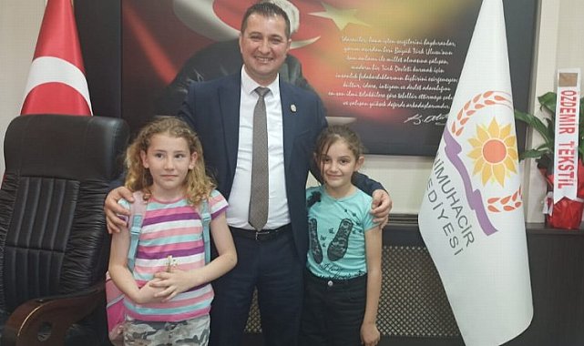 Yenimuhacir Belediye Başkanı Tamer Kıral'a, 23 Nisan Ulusal Egemenlik ve Çocuk Bayramı öncesi iki minik konuk ziyarette bulundu.Erdoğan DEMİR / EDİRNE (İGFA) - 31 Mart'ta Yenimuhacir Belediye Başkanlığı koltuğuna oturan Tamer Kıral'a, yaklaşan 23 Nisan Ulusal Egemenlik ve Çocuk Bayramı nedeniyle iki minik konuğun ziyareti kendisini mutlu etti.23 Nisan öncesi iki öğrenci belediye başkanlarını ziyarete gelerek kendisine ellerindeki çiçekleri hediye ettiler ve Kıral'a görevinde başarılar diledi.Kıral, kendisini ziyarete gelen minik konuklarına teşekkür etti ve şunları söyledi. "Dünyada Atatürk'ün ilk kez çocuklara hediye ettiği Ulusal Egemenlik ve Çocuk Bayramı öncesi beni bu ziyaret çok mutlu etti. Ellerindeki minik çiçekleri de beni çok duygulandırdı. Dünyada Atatürk'ün çocuklara hediye ettiği Ulusal Egemenlik ve Çocuk Bayramı için ne kadar teşekkür etsek azdır. Tüm çocuklarımızın Ulusal Egemenlik ve Çocuk Bayramı şimdiden kutlu olsun." Dedi.