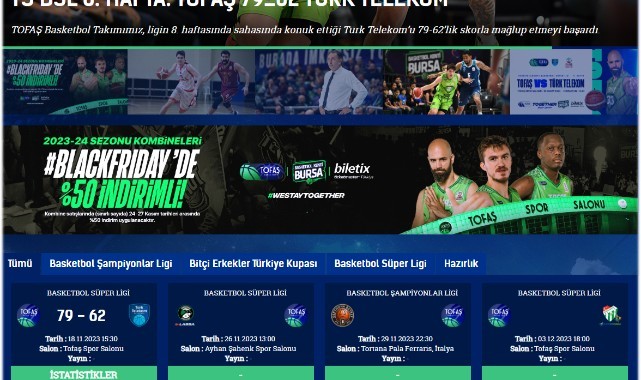 Türkiye Sigorta Basketbol Süper Ligi ve Basketbol Şampiyonlar Ligi'ndeki mücadelesine devam eden TOFAŞ'ta 2023-2024 sezonu kombine fiyatlarında büyük indirim başladı.BURSA (İGFA)- Mavi Yeşillilerin Nilüfer TOFAŞ Spor Salonu'nda oynayacağı tüm iç saha maçlarını kapsayan kombine biletlere (sınırlı sayıda), 24-27 Kasım tarihleri arasında yüzde 50 indirim uygulanacak.Biletix'in #BlackFriday etkinliği kapsamında gerçekleştirilecek indirimli kombine satışları, sadece Biletix.com'dan online olarak yapılacak.