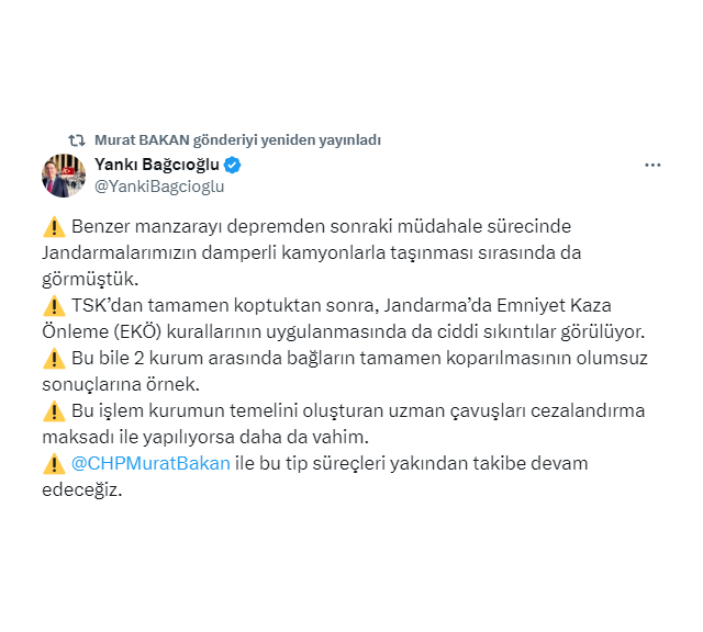 Hani ile Lice arasındaki bu çocuklar, bu vatan evlatları Allah muhafaza kaza olsa dahi sağ çıkabilirler mi, sakat kalırlar mı? Ateş altında kalsalar, pusuya düşseler ki Hani-Lice arasındaki yol geçmişte en çok pusu atılan, en çok şehit verdiğimiz yollardan biri. Ellerinde ne silahları ne de mühimmatları var. Araç arkasında ya da önünde zırhlı bir araç olmalı, ancak gördüğümüz kadarıyla arkasında emniyet aracı yok, önünde var mı, onu da bilmiyoruz. Yani neresinden bakarsanız bakın, elinizde kalacak bir rezillik. Konuyu Milli Savunma'dan sorumlu Genel Başkan Yardımcımız Yankı Bağcıoğlu'na da ilettim. Birlikte takip edeceğiz. Karıncanın kardeşi var, uzman çavuşun kardeşi var, o da Cumhuriyet Halk Partisi. Konunun takipçisi olacağız."