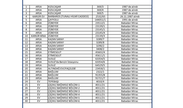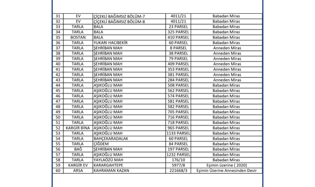 Bildirimde, çoğunluğunun anne ve babadan miras yoluyla elde edildiği ifade edilen 22 arsa, 23 tarla, 9 ev, 1 bostan, 1 bağ, 2 kargir ev ve 2 kargir bina yer aldı.