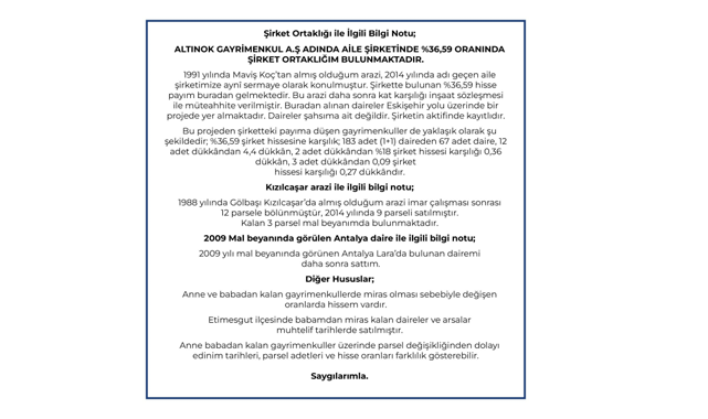 Altınok, şirket ortaklığıyla ilgili açıklamasında da şunları belirtti: "Altınok Gayrimenkul AŞ adında aile şirketinde yüzde 36,59 oranında şirket ortaklığım bulunmaktadır. 1991 yılında Maviş Koç'tan aldığım arazi, 2014 yılında adı geçen aile şirketimize ayni sermaye olarak aktarıldı. Bu sebeple, şirketteki yüzde 36,59 hisse payım bu araziden kaynaklanmaktadır. Söz konusu arazi, daha sonra bir müteahhide kat karşılığı inşaat sözleşmesiyle verildi. Bu projeden elde edilen daireler bana ait değil, şirketin aktifinde kayıtlıdır. Şirket hisselerime düşen paylar ise şu şekildedir: Yüzde 36,59 hisse için 183 adet 1+1 daire, 12 dükkanın 4,4'ü, yüzde 18 hisse için 2 dükkanın 0,36'sı, yüzde 9 hisse için 3 dükkanın 0,27'si."
