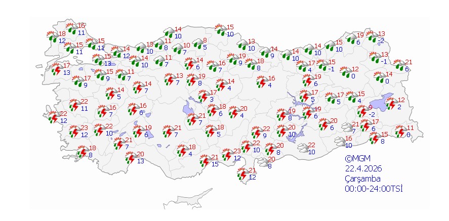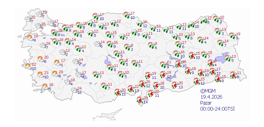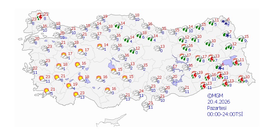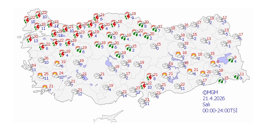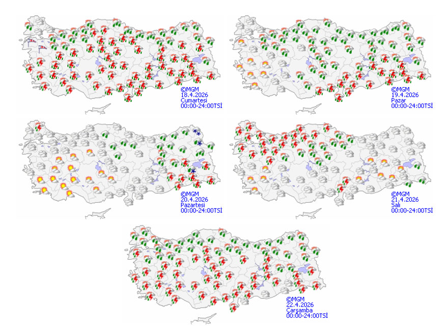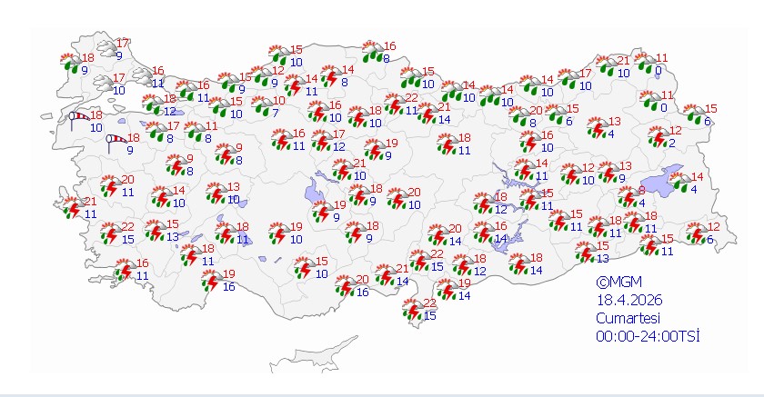 MGM tahminlerine göre Marmara, Ege, Akdeniz, İç Anadolu, Karadeniz, Doğu ve Güneydoğu Anadolu bölgelerinde kuvvetli sağanak yağışlar etkili olacak. Yağışların gün boyunca aralıklarla devam etmesi öngörülüyor.