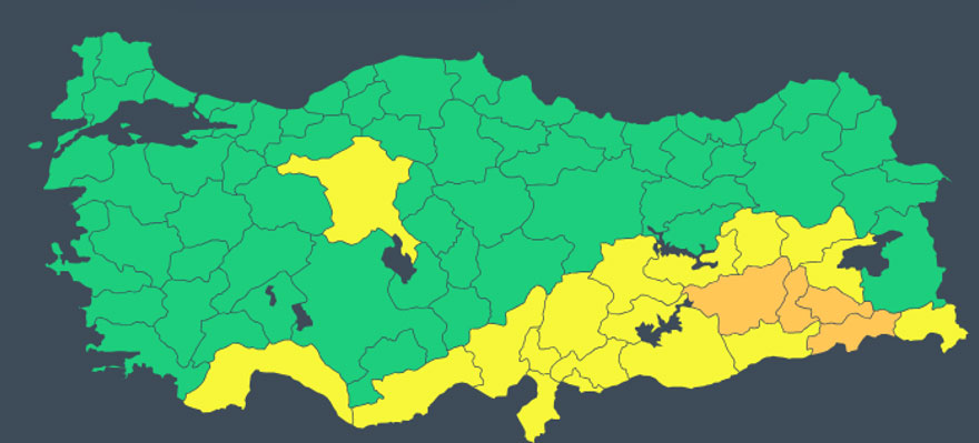 Meteoroloji, olumsuz hava koşulları nedeniyle 22 il için sarı ve turuncu kodlu uyarı yayımladı. Uyarı verilen iller arasında Adana, Adıyaman, Ankara, Antalya, Bingöl, Bitlis, Diyarbakır, Elazığ, Gaziantep, Hakkari, Hatay, Mersin, Malatya, Kahramanmaraş, Mardin, Muş, Siirt, Şanlıurfa, Batman, Şırnak, Kilis ve Osmaniye yer alıyor.