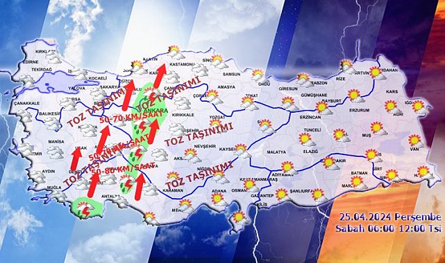 Meteoroloji'nin günlük hava tahmin raporuna göre, bugün rüzgarın, İç Ege, Batı Akdeniz'in iç kesimleri, İç Anadolu ile Batı ve Orta Karadeniz'in iç kesimlerinde güney ve güneybatı yönlerden kuvvetli ve yer yer fırtına (40-80 km/saat) şeklinde esmesi beklenirken, aynı bölgeler için yer yer toz taşınımı uyarısında bulunuldu. Vatandaşların hava kalitesinde azalma ve ulaşımda aksamalar gibi olumsuzluklara karşı dikkatli ve tedbirli olunması istendi.ANKARA (İGFA) - Meteoroloji Genel Müdürlüğü, 25 Nisan Perşembe gününe ilişkin hava tahmin raporunu yayımladı. Yapılan son değerlendirmelere göre Türkiye'nin kuzey, iç ve batı kesimlerinin parçalı ve çok bulutlu, Batı Akdeniz, İç Anadolu'nun batısı, Edirne, Kırklareli, Çanakkale, Kocaeli, Sakarya, Bursa, Bilecik, Bolu, Düzce, Karabük, Zonguldak ve Bartın çevrelerinin yerel olmak üzere sağanak ve gök gürültülü sağanak yağışlı, diğer yerlerin az bulutlu ve açık geçeceği tahmin ediliyor. İç Ege, Batı Akdeniz, İç Anadolu ile Batı Karadeniz'in iç kesimlerinde yer yer toz taşınımı bekleniyor.Hava sıcaklığında önemli bir değişiklik olmayacağı, mevsim normalleri üzerinde seyretmeye devam edeceği tahmin edilirken, rüzgarın genellikle güney, güneydoğu kesimlerinde kuzey yönlerden hafif, ara sıra orta kuvvette, İç Ege, Batı Akdeniz'in iç kesimleri, İç Anadolu ile Batı ve Orta Karadeniz'in iç kesimlerinde güney ve güneybatı yönlerden kuvvetli ve yer yer fırtına (40-80 km/saat) şeklinde esmesi bekleniyor.Rüzgarın, İç Ege, Batı Akdeniz'in iç kesimleri, İç Anadolu ile Batı ve Orta Karadeniz'in iç kesimlerinde güney ve güneybatı yönlerden kuvvetli ve yer yer fırtına (40-80 km/saat) şeklinde esmesi beklendiğinden yaşanabilecek, ulaşımda aksamalar, çatı uçması, iç kesimlerde toz savrulması gibi olumsuzluklara karşı dikkatli ve tedbirli olunması istendi.Ayrıca İç Ege, Batı Akdeniz, İç Anadolu ile Batı Karadeniz'in iç kesimlerinde yer yer toz taşınımı beklendiğinden, görüş mesafesinde düşme, hava kalitesinde azalma ve ulaşımda aksamalar gibi olumsuzluklara karşı dikkatli ve tedbirli olunması da uyarılar arasında yer aldı.